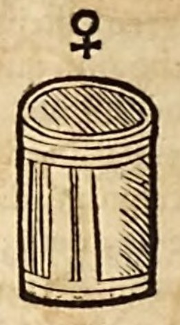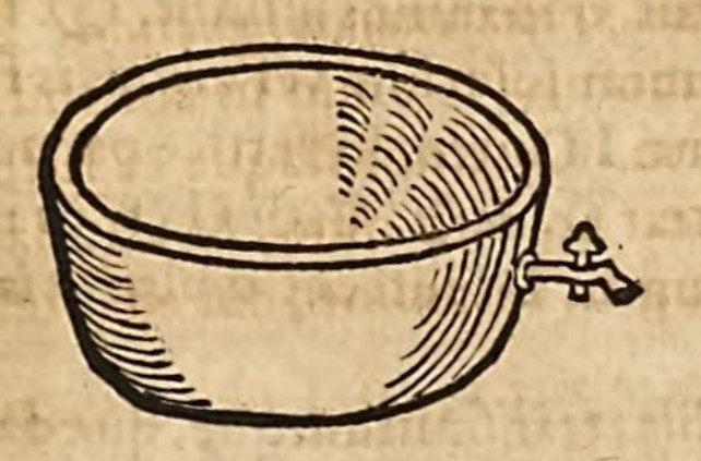 2.- Ahenum: recipiente metálico, de cobre o de hierro, de dos pies de altura y de casi la misma anchura. Tiene una tapadera, para cubrirle, hecha de una lámina de cobre redonda con una abertura en el centro para colocar la cucúrbita. El diámetro de este agujero debe coincidir con el de la cucúrbita. Tiene también otro agujero al lado para que pueda salir el vapor y para introducir agua: