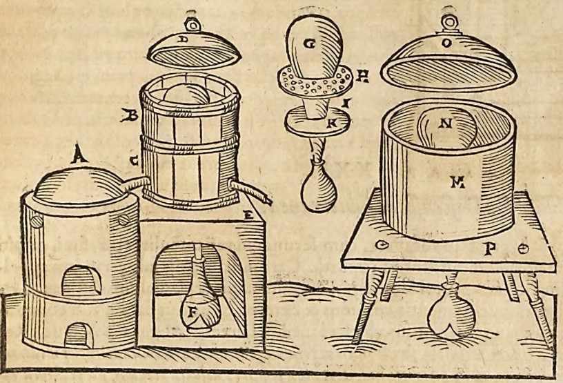 4) Excipulus geminatus ventriculosus & in posteriorem: dos recipientes con forma de vientre. Los espíritus más sutiles pasan al segundo recipiente.