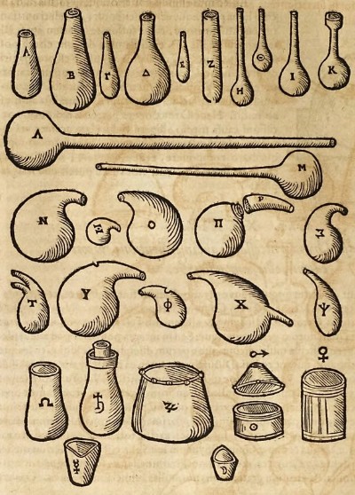 Θ I Λ Μ) Son de la misma clase que las fiolas (redomas).En estas fiolas de cuello largo se recogen los espíritus.