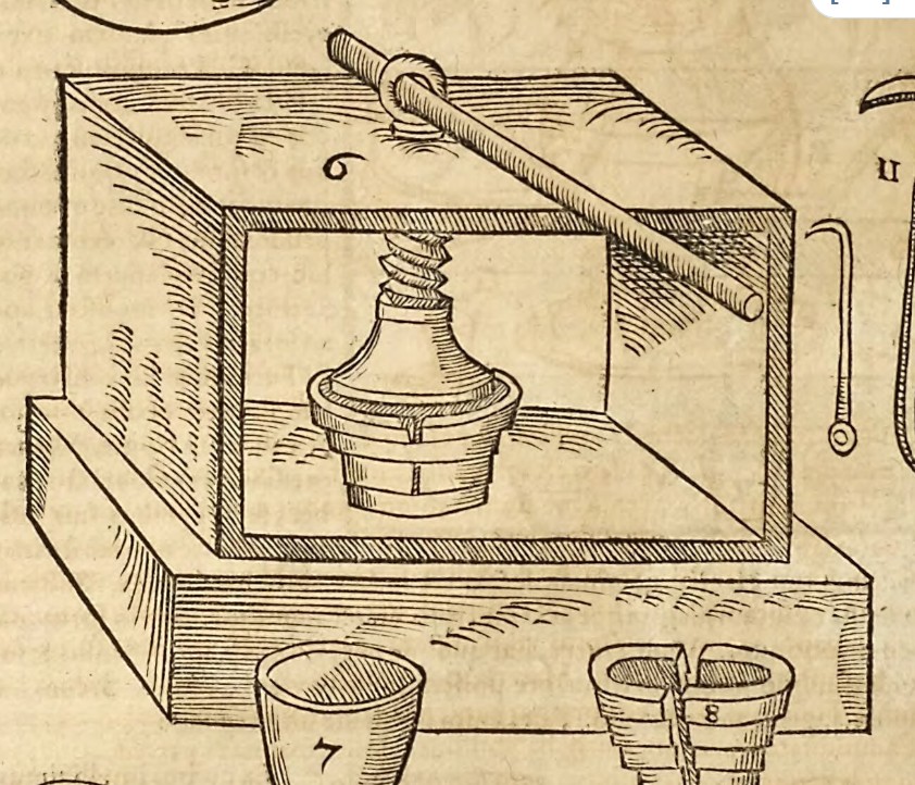 Catini fictiles triqueti: crisoles triangulares de barro. LIBAVIO (1606), p. 172.