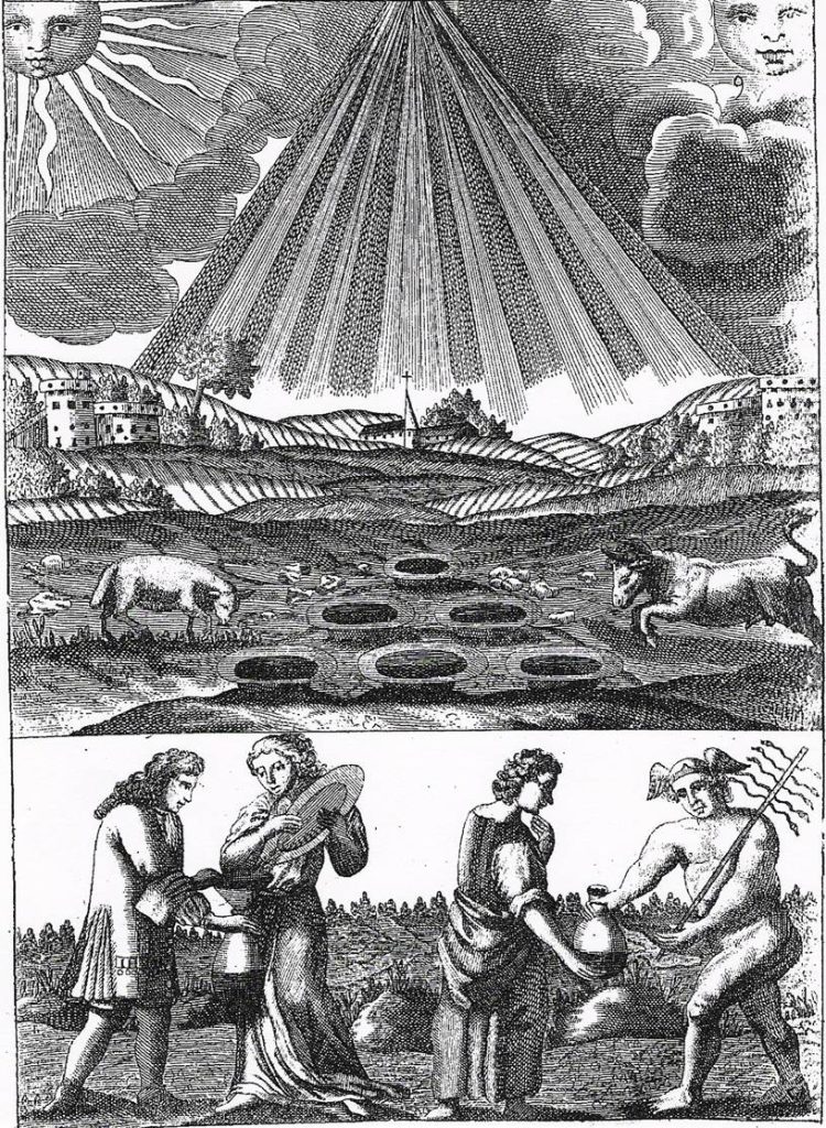 El Mutus liber, libro mudo, dedica tres grabados al tema de la recolección del rocío celeste. Eugene Canseliet nos explica de la siguiente forma el significado de estas operaciones: “No hay necesidad alguna de haber adquirido grandes conocimientos de alquimia para darse cuenta de que los grabados del libro mudo, traducen operaciones en el curso de las cuales interviene, de forma decisiva, la energía del cosmos. Su fuente es inmensa y su poder todo poderoso, tal como lo indican con nitidez los grabados 4, 9 y 12 al mostrarnos el haz gigantesco del fluido acuoso proyectado sobre la tierra, desde lo alto del cielo, entre las dos grandes luminarias, el sol y la luna”.[6]