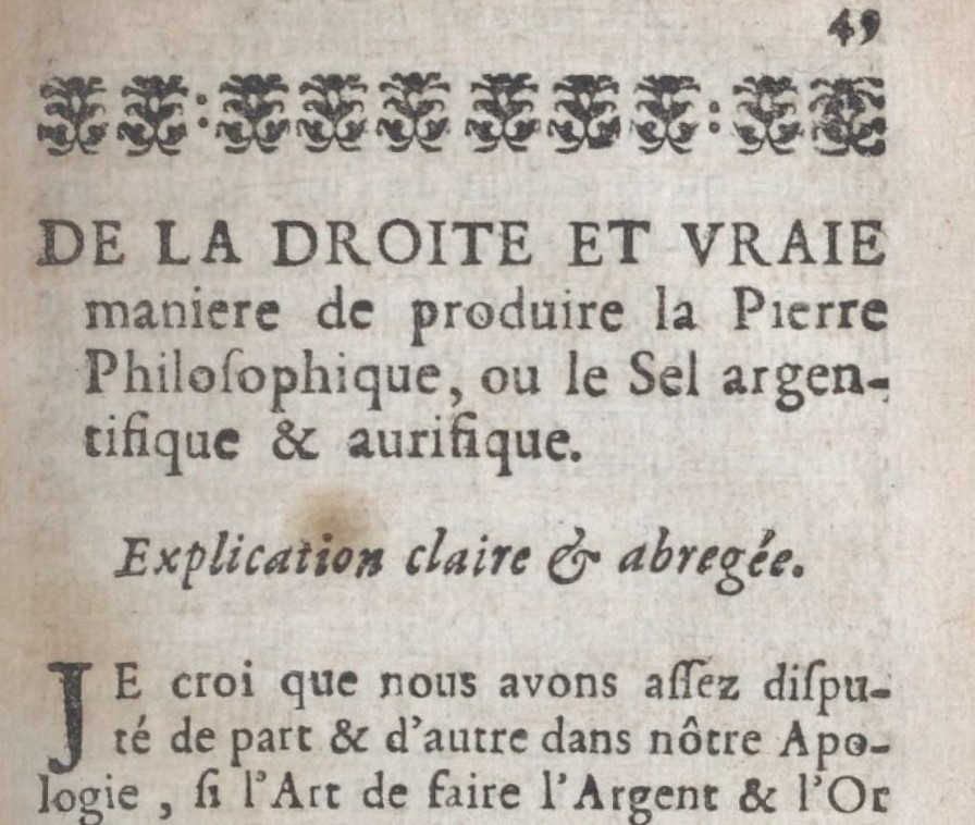 Traducción al castellano de Anónimo, De la Droite et Vraie maniere de produire la Pierre Philosophique , ou le sel argentifique & aurifique, A Paris, chez Laurent d’Houry, ruë Saint Jacques, devant la fontaine Saint Severin, au Saint Esprit. M. DC. XCV.