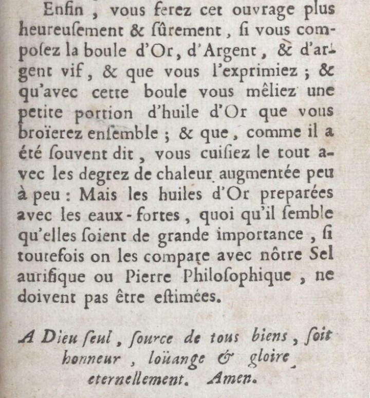 Para responderles, no negaré que algunas sales no se puedan convertir con Arte en agua y una consistencia líquida, y que el oro se disuelva más rápidamente que con mercurio, y que por la fuerza de estas aguas y sus muy fuertes facultades, parece en apariencia que el Oro se disuelve; pero no es verdad, ni está despojado de su naturaleza metálica; porque no parece disolverse sólo mientras retenga este licor salado, que no está verdaderamente mezclado ni unido con el Oro, ya que las cosas de naturaleza diferente no se mezclan realmente. Así que este licor salado sacado por el fuego violento, se enrarece en vapor y asciende; pero el oro permanece en el fondo como un polvo amarillo fijo, que se derrite si le agregamos soldadura de oro y vuelve al oro sin desperdicio; pero el azogue, que hemos dicho que es la otra parte de la semilla, disuelve verdaderamente el Oro, se une y se queda con él para siempre; porque son de la misma forma, pero no del mismo temperamento, o más bien de la misma perfección. Una vez terminada la disolución y fijación de los dos, el polvo o nuestra Sal Aurífica ya no puede volver a ser Oro, a menos que se arroje en una cierta proporción a los otros metales o azogue: Porque esta Sal es una verdadera tintura y un aceite muy fijo, y de una esencia muy sutil.
