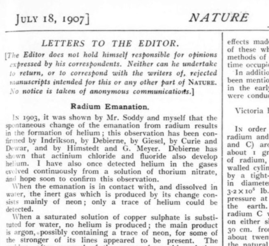 “Cuando el fallecido Stephen Emmens, de esta ciudad, afirmó que había convertido la plata en oro los científicos se rieron de él desdeñosamente ya que no tomó los pasos necesarios para asegurar el juicio de personas competentes sobre su trabajo. El procedimiento de Sir William Ramsay es muy diferente, y siempre lo ha sido. El lenguaje reservado que ahora emplea no indica que tenga una conclusión final con respecto a sus últimas investigaciones. Si alguna vez llegara a estar completamente satisfecho, sin embargo, de que de un tipo de materia se pueda hacer de otra con la ayuda de energía liberada por el radio en descomposición, hay una gran probabilidad de que su creencia sea correcta”. [2]