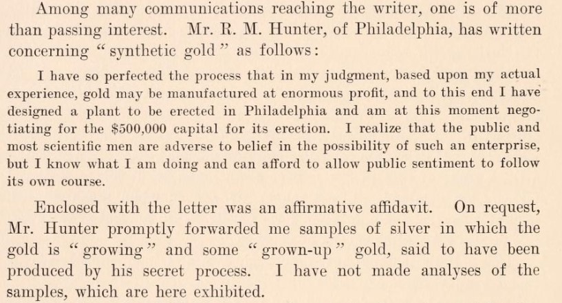 El Sr. R. M. Hunter, de Filadelfia, ha escrito sobre el «oro sintético» de la siguiente manera: He perfeccionado el proceso a mi juicio, en base a mi experiencia real, oro puede ser fabricado con enormes ganancias, y para este fin he diseñado una planta para ser erigida en Filadelfia y actualmente estoy negociando el capital de $ 500,000 [necesario] para su erección Me doy cuenta de que el público y la mayoría de los científicos son adversos a la creencia en la posibilidad de tal empresa…
