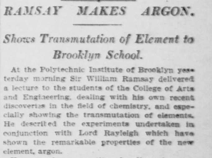 Más directo fue el New York Tribune el 5 de octubre de ese mismo año, y el propio Ramsay, en la crónica sobre su conferencia en el Instituto Politécnico de Brooklyn, hablando claramente de «la transmutación de los elementos.
