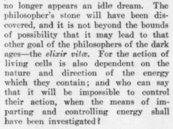 “Si estas hipótesis son correctas, entonces la transmutación de los elementos ya no aparece como un sueño ocioso. La piedra filosofal habrá sido descubierta, y no está más allá de los límites de la posibilidad que puede conducir a ese otro objetivo de los filósofos de la edad oscura: el elixir vitae. La acción de las células vivas también depende de la naturaleza y dirección de la energía que contienen; y quién puede decir que será imposible controlar su acción cuando los medios para impartir y controlar la energía hayan sido investigados?”[9]