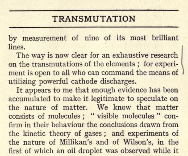 “La evidencia demuestra que todos los metales pueden estar experimentando una transformación gradual y que todos los elementos pueden ser compuestos construidos a partir de alguna materia prima en condiciones durante las cuales se infunden grandes cantidades de energía. Lo que llamamos elementos son, muchos de ellos, meramente compuestos muy estables, que antes de que comiencen a cambiar, requieren absorber una gran cantidad de energía. ¿Cómo es eso de energía que debe ser aplicada? Con toda probabilidad, el proceso está sucediendo en las estrellas más calientes. También es posible producir un cambio similar en la Tierra, para causar una transmutación. Pero vemos cómo hay poca analogía entre las opiniones antiguas y modernas; los antiguos pensaban alterar las cualidades de un elemento que debería volverse idéntico a otro; Nosotros los modernos, desde nuestra concepción de la materia, y el conocimiento del comportamiento de compuestos de diferentes órdenes de estabilidad, con la prueba positiva de que el radio, a través de su emanación, pasa a helio como uno de sus productos, y con la prueba, también, de que los metales bajo la influencia de electrones de descarga de luz ultravioleta pueden ir más allá, y esperamos en el futuro cercano el cambio de unos elementos en otros. Lo que esto sea, no lo sabemos todavía.”[3]
