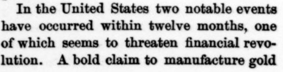 «[Dada] la reciente reactivación del interés en la alquimia y las sugerencias publicadas de que el oro artificial podría ser tan abundante como el metal natural perdiendo su valor como base de la moneda, traemos hoy desde el Servicio Geológico de los Estados Unidos una declaración de que no existe la posibilidad de que los químicos esperen, ni los economistas tengan miedo, a la perspectiva del metal precioso siendo producido en el laboratorio».