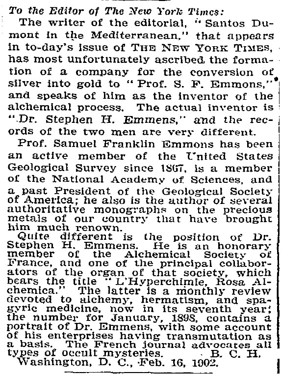 Las afirmaciones de Edward C. Brice de tener el oro manufacturado a partir del antimonio fueron descartadas por la Oficina de Patentes de los Estados Unidos, pero las de Emmens, incluida la su venta de seis lingotes de una aleación de plata y oro a la Oficina de Ensayos de los Estados Unidos, fueron más difíciles de descartar. Cobró por los seis lingotes 954 dólares desde el 24 de abril de 1897. Pero ya antes de la Primera Guerra Mundial y de la creciente preocupación por el patrón-oro en los Estados Unidos y Gran Bretaña, muchos artículos de periódicos estaban más interesados en temas del fraude alquímico de lo que estaban sobre las amenazas a las economías nacionales de Occidente.