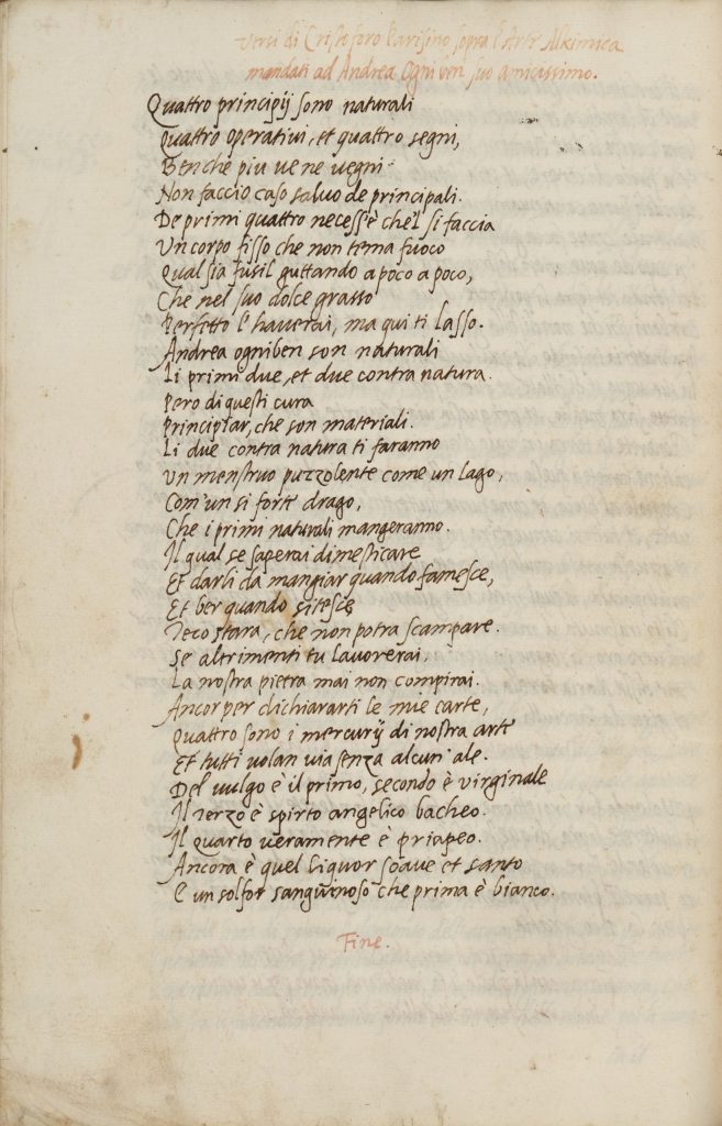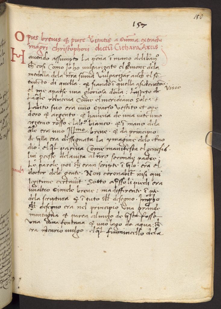 21. 150v-170r: Christophorus Parisienses. ‘Cithara artis’ sive tractatus de arte chymica abbreviatus et italice conscriptos cum proemio. Incip: “Se lo excelso et glorioso…”. Exp.: “sia laudato et glorificato”. Cithara incip: ”Havendo assumpto la penna…”. Cithara expl.: “sequitali altri magisteri”.