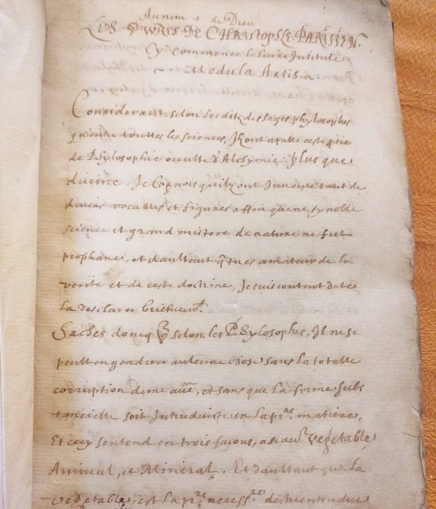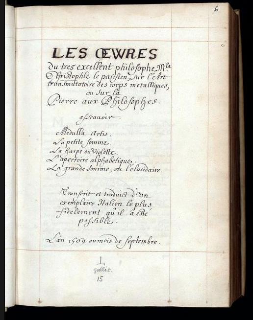 6 : Les oeuvres du tres excellent philosophie, maistre Christophle le Parisien, sur l’art transmutatoire des corps metalliques ou sur la pierre aux philosophes, asscavoir Medulla artis, la Petite Somme, la Harpe ou Violette, l’Apertoire alphabétique, la Grande Somme ou l’Elucidaire. Transcrit et traduit d’un exemplaire italien le plus fidèlement qu’il a esté possible, l’an 1569, au mois de septembre’.