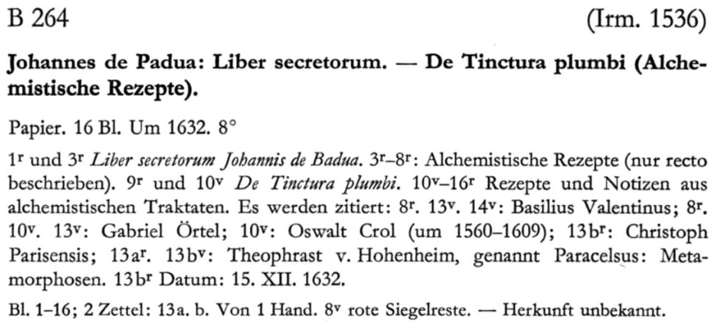 36-43 (aunque con foliación independiente 1 a 8): Rota de compositrione lapidis philosophici extracta ex philosophorum libris, tum praecipue ex Raymundo Lullo, Christophoro Parisiensi, Arnaldo de Vila nova, et textu alchimico elucidata per Jacobum Bracium Flandrum. 3 partes escritas de varias manos. También se adjuntan libremente 2 hojas en folio y 5 hojas en cuarto con recetas en alemán y en latín de Siegfred Pfinzing datadas en 1604. En la segunda parte se lee: “Math. Santner ex Rochio Bachio 1595”, la tercera parte es de los siglos XVI y XVII.