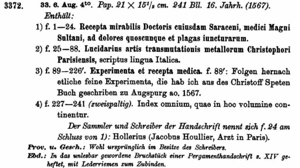 Título: Recepta mirabilis Doctoris cuiusdam Saraceni, medici Magni Sultani, ad dolores quoscunque et plagas iuncturarum. Fecha de origen: siglo XVI (1567). Ortografía alternativa, en 4º. Número de catálogo: Heinemann nº 3372. Material de escritura: papel. 241 hojas. Formato: 210 x 155 cm. Configuración de página: texto a dos columnas, encuadernado en el fragmento ahora ilegible de un manuscrito en pergamino del siglo XIV, con correas de cuero para atar. Procedencia del manuscrito: probablemente originalmente propiedad del escriba. El coleccionista y escritor del manuscrito está en el f. 24: Jacobus Houllier (Hollerius), médico en París.