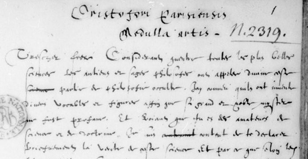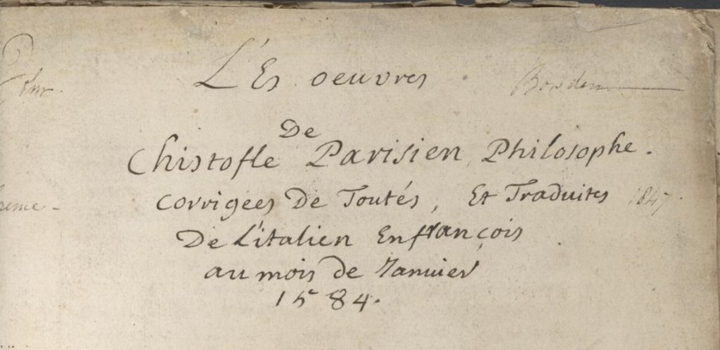 «Les oeuvres de Christophle Parisien tres excellent philosophe corrigées de toute superfluité traduites d’itallien en françois au mois de janvier 1584 doublées à Paris par Monsieur de la Bonaventure 1585 et coppiées par moy Guillaume Meslam sur son double l’an 1591 estant lors a Vendosme»: así se lee al principio de este manuscrito. La misma premisa, con palabras casi idénticas, se encuentra en otros dos códices que contienen una colección de sus obras: el ms. fr. 19071 de la Bibliothèque nationale de France, donde sin embargo se reemplaza el nombre del traductor por las iniciales «E.A.D.M.», y el ms. 192 de la Wellcome Library de Londres, que omite cualquier indicación onomástica.