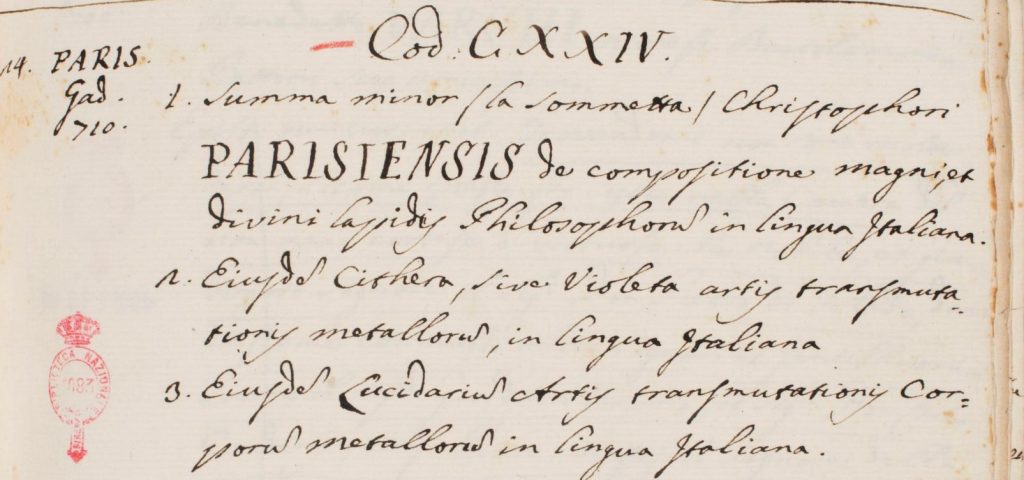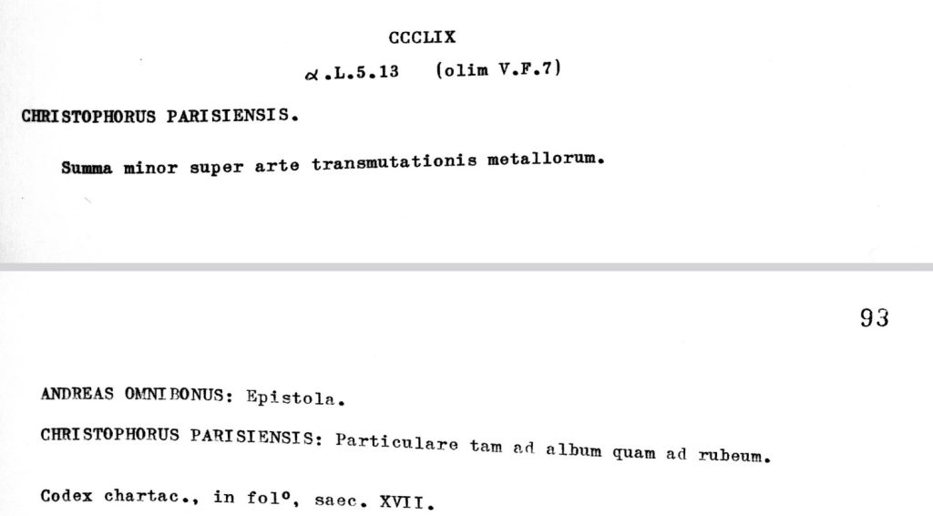A continuación se ofrece una lista de los manuscritos que he ido elaborando sobre el alquimista veneciano del siglo XV Christophoro Parisiensis, fiel seguidor de la doctrina pseudo-luliana. El listado es provisional porque aún están siendo revisados, al menos, tres manuscritos, que indicaremos al final, como candidatos para estar presentes en este listado. Aparecen bajo otros nombres, o tienen una atribución errónea. Quiero expresar mi agradecimiento a Ellen Embleton, de la Royal Society (Londres); Elisa Montali, de la Biblioteca Palatina (Parma); Ksenia Soshnikova, de la Biblioteca Nacional Rusa (San Petersburgo); Valerie C. Stenner (Library Assistant II, Special Collections, Morris Library, University of Delaware) y Curtis Small (Senior Assistant Librarian, Coordinator, Public Services, University of Delaware Library Special Collections), Inés del Álamo Fuentes, Jefa de Servicio Biblioteca del Hospital Real (Granada), a Daniela Fugaro, del Departamento de Manuscritos de la Biblioteca Alessandrina.