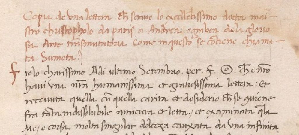 2a-37a: L’alfabeto apertoriale di Cristoforo Parigino ad Andrea O. Incipit: Charissimo figliolo, a di ultimo di giugno hauemo riceuuto le uostre lettere. Explicit: et imitare li tuoi antichi padri filosofi che hebbero tanta cura in celare simili. Di Parigi A di pº di settbe MCCCLXXVI.