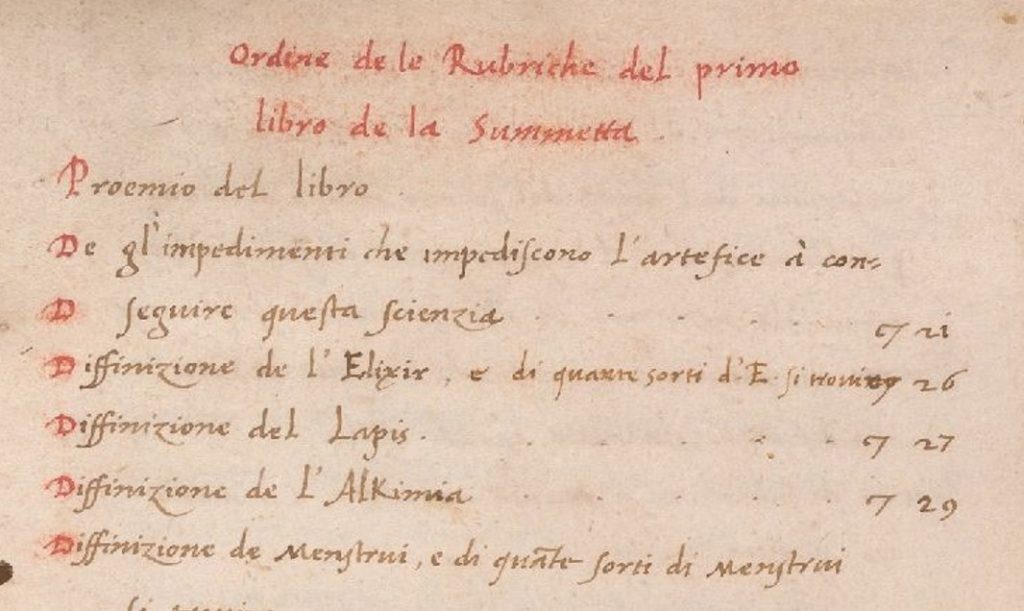 1a: “Tabula de la rubriche de la Summetta cioe Violetta circa le opere minerale.” Aunque este título parezca indicar que la Summetta y la Violetta son la misma obra no es así.