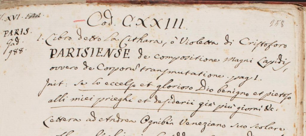 262a-263a: Listado de las obras de Cristóforo Parisiense: Lucidario sive summa maggiore, explicit: Misericordias domini in eternum cantabo; De arbore philosophico, explicit: Secondo la universale sentencia; La somma minore, explicit: Fiolo carissimo adi ultimo settis…; La cittara o violetta, explicit : Se Teccelso et glorioso dio…; Alfabeto Apertoriale, explicit : “Carissimo fiolo, respondo a vostre littere… “Piglia d’ottimo A. de vino negro…”