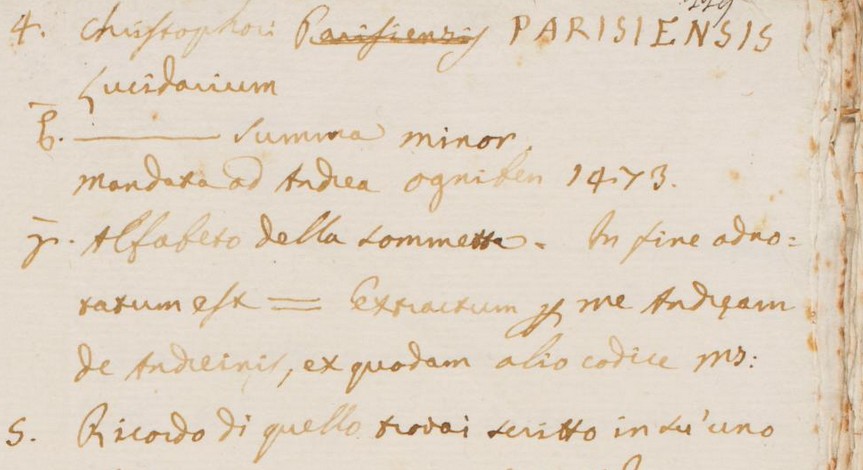 22. 170v-223v: Christophorus Parisienses, Lucidarium italice conscriptum. Incip.: “A cio che fiolo postano…”. Exp.: “le anime di quali siano benedette.”