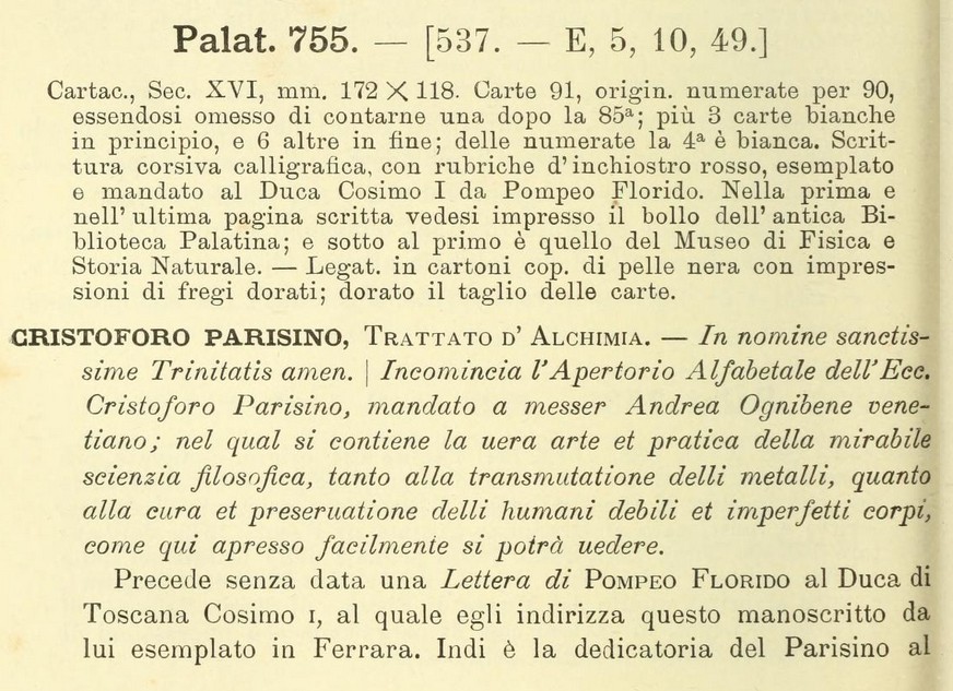 Olim HH.V.44. Título: CHRISTOFORO PARIGINO, “TRATTATI DI CHIMICA”. Manuscrito en papel, II+116 páginas, in 4º, siglo XVI. Termina: “E finito in parma il di XXVII setiembre MDXCIIII”, copiado por Smeraldo Smeraldini. 175 x 115 mm, a una columna, numeración arábica antigua en el ángulo superior derecho del verso en tinta negra. Cubierta en pergamino de 235 x 175 mm. Costura en tres nervios. Dibujos en 115a: Baño físico; 116a: Vaso circulatorio y 116b: Vaso fijatorio.