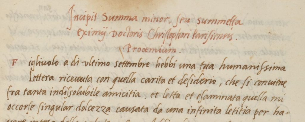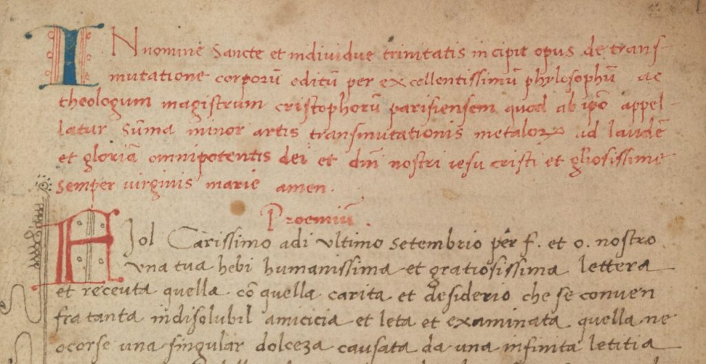 1r-17v: Christophorus Parisiensis (citado en 1r): Inc.: summa minor, seu summetta eximij doctoris Christophori Parisiensis. Expl: Summa minor, seu summetta appellatur super arte transmutationis metallorum. Incipit (proemio): Figliuolo a di ultimo settembre hebbi una tua humanissima lettera (1r), Explicit (proemio) : Domini est terra et plenitudo eius orbis terrarum et universi qui abitant in eo. (4v). Incipit (texto): Restiamo a narrarvi i due impedimenti dell’arte. Il primo è (4v). Al final del incipit se lee: “Explicir opus editum per excellentissimum philosophum, et theologum, magistrum Christophorum Parisiensem, quod ab ipso Summa minor, seu summetta appellatur, super arte transmutationis metallorum. Ad laudem Dei Altissimi…”