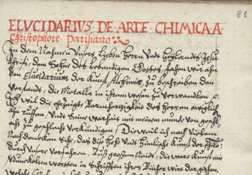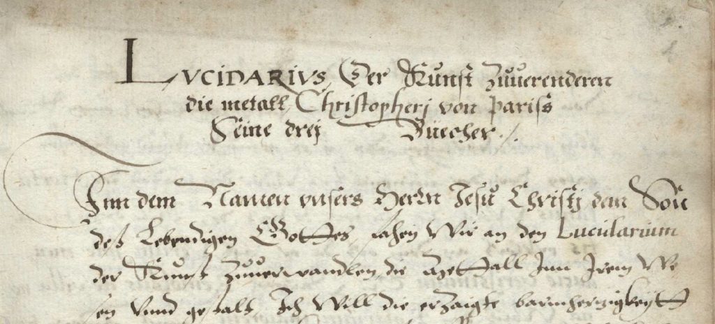 El Lucidario (Elucidarius, Lucidarius) es una obra alquímica de Christopher Paris (ver más abajo) que recopila las enseñanzas de varios maestros anteriores y publicado en la versión italiana. Existe una versión alemana, publicada varias veces en el siglo XVII (primera edición: «Elucidarius Christophori Parisiensis, das ist ein edles Büchlein vom rechten Grund, Mittel und Ende der wahren Philosophiae, oder grossen Stein der alten Weisen vor etlich hundert Jahren», Kruseck 1608?) En el que se afirma que es una traducción del latín. La versión latina declarada como traducción (ex lengua gala) se da en Lazarus Zetzner, “Theatrum chemicum”, Argentorati 1613-1622, vol. VI, págs. 195-270 (consultado en la edición de 1661). El Lucidarius también está presente en numerosos manuscritos de finales del siglo XV y principios del XVI. Dada la ubicación de este códice (norte de Italia, seguramente Venecia), se pueden comparar con otros manuscritos cercanos, como los de la Biblioteca Marciana IT. Z. 79 (4815), IT. II. 55 (5036) e IT. III. 44 (5053) tienen el texto en muchos lugares diferentes a éste. También en el manuscrito IT. II. 55 el tercer libro está incompleto.