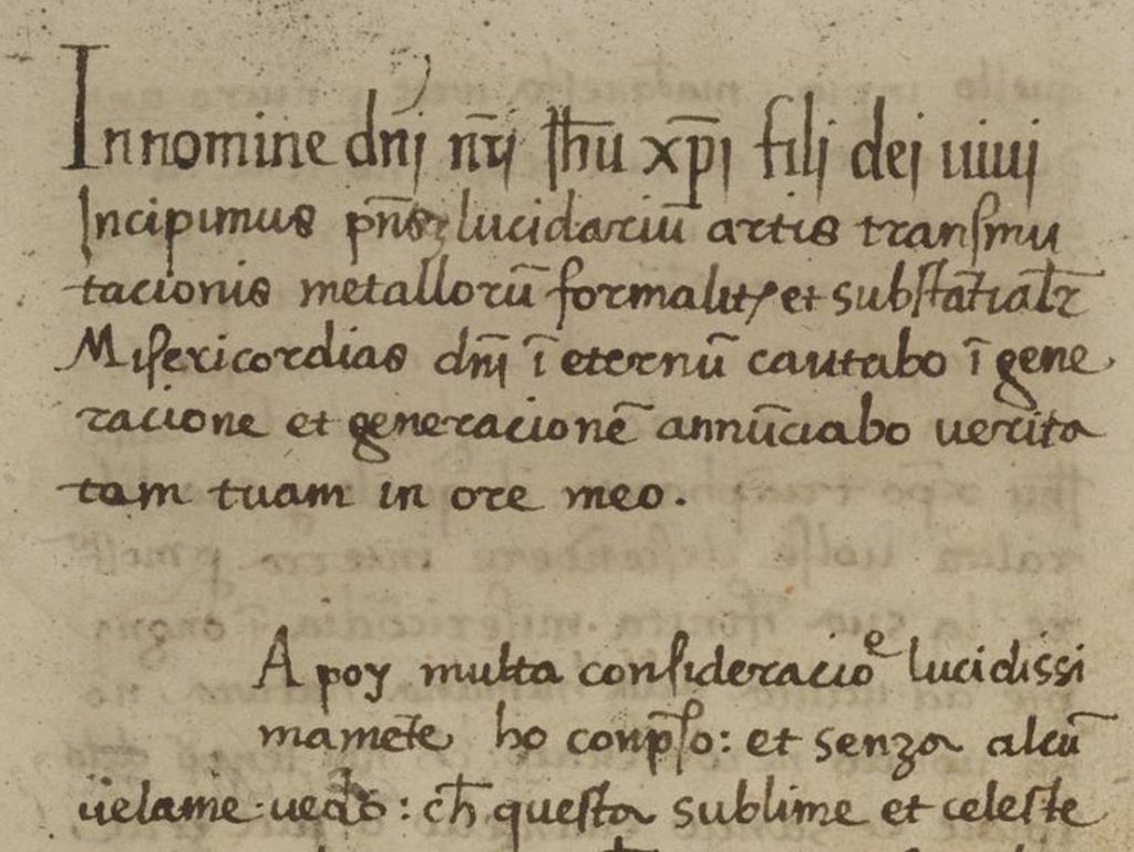 ff. 1r-51v. CHRISTOPHORUS PARISIENSIS: LUCIDARIUM (DELLA TRANSFORMAZIONE DEI METALLI). (1r) Columna en latín. In nomine dei altissimi auctoris et reparatoris naturarum universarum qui dixit et facta sunt mandavit et create sunt misericorditer egit et reparate sunt cui sit honor et gloria Opus magni lapidis incipit editum per excellentissimum philosophum ac theologum magistrum cristophorum parisiensem quodur ab ipso Lucidarium nuncupatur artis transmutationis metallorum formaliter et sustancialiter. (1r-22r) Texto. Libro I >MISERICORDIAS< Domini in eternum cantabo in generatione et generatione. Anunciabo veritatem tuam in ore meo. Da poi molta consideratione habiamo compreso et senza alcuno … – … Molti secreti te habiamo manifestado in questo capitulo siche al fine semo pervenuti cum la gratia de lo Signore nostro misser iesu cristo. >Finisse el primo libro de maistro cristophoro parisiense de la vera transmutatione di corpi FINIS.<. (22r-42v) Texto. Libro II. >Questo si è lo secondo libro de maistro cristophoro parisiense ditto libro del’arboro philosophicho COMENZA< el secondo libro del’arboro philosophico diviso in quattordese parte. La prima è de inventione mercurii philosophorum et eius preparatione atque utrefactione. Secunda est de modo extrahendi (22v) >A< ac reducendi eam in >B< … – … Si che filiolo in qusto capitulo assai Secreti te habiamo semenato et tu cum la prudencia tua li recolii però discazernada te ogni obscuritade. Texto. Libro III. >Qui comenza el terzo libro dove comenzemo a praticare dele medicine del primo ordine e prima la intencion di quelle cum le reprobation dele sophistarie di geber [?] co modo che lui mette ditte me[dici]ne. [43r] HAVENDO <nela virtù de dio vivo expedire le parte del’arbor de la arte transmutatoria per la quale … – … Et qui finisse la medicina del terzo ordine la moltiplication cum la prosectione et examinatione non la meteremo in questo loco per che di quele habiamo parlato largamente in lo nostro tractado grande el qual se a dio piacerà cum tempo te ‘l mandaremo. >Explicit alphabetum cristofori parisiensis de vera corporum transmutatione ad laudem dei et gloriose semper virginis marie matris et sanctorum apostolorum petri et pauli et beati francissi amen< (51v-52r) Alphabetum (en latín) – tabla y texto. > ALFABETO DE SEQUITUR. < >A< chaos principium …– … Modus vero operationis eius super corpora est ut supra diximus in arbor ph[ilosoph]yco amen.