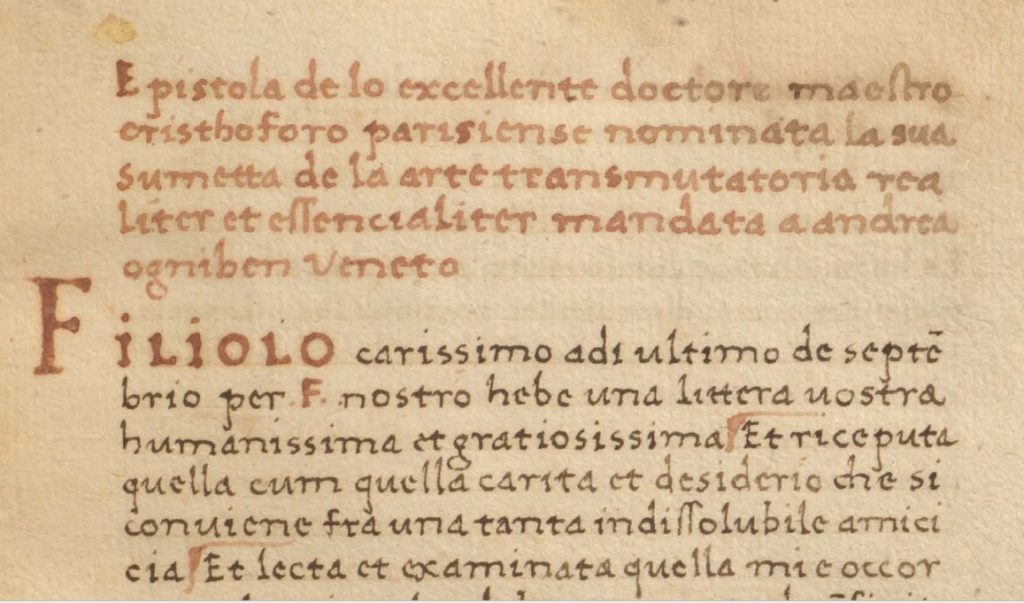 ff. 52v-77r. CHRISTOPHORUS PARISIENSIS: SUMMETTA. (52v) Título: >Epistola del excellente doctore maestro cristophoro parisiense nominata la summetta de la arte transmutatoria.< (52v-75r) Texto: > FILIOLO <carissimo ad ultimo de septembrio … – … La sancta fede catolica dominando questo tiranno inimico del signore nostro patre celeste. Ex parisio 1472 die 14 septembris Maistro cristoforo vostro> FINIS < >SEQUITUR ALPHABETUM SUPRASCRIPTI OPERIS MAGISTRI CRISTOFORI PARISIENSIS MISSUM DIE XVIII AUGUSTUM 1573. (75v) Alfabeto (en latín). > Alphabetum magistri cristofori parisiensis pro suprascripta sumetta <… –…> K <significat heatm first gradus. (76ro-77ro) Alfabeto (otro alfabeto, en latín). > Incipit aliud alphabetum sumette cristophori parisiensis < > A <significat deum… – …> Explicit alphabetum sumette cristofori parisiensis missum andree omnibono veneto die XVIII augusti 1473. ex parisio<. La «Summetta» está dirigida a Andrea Ognibene, discípulo de Cristóforo Parisiense. Se abre con la historia de Cristóforo yendo al convento y con la visión de San Francisco que lo anima a estudiar y practicar la alquimia. Si se compara con los manuscritos de la Biblioteca Marciana IT. Z. 79, IT. III. 38 e IT. III. 44 se revelan diferencias textuales significativas. El alfabeto de la «Summetta» en este manuscrito está en latín mientras que en el IT. III. 38 está en italiano.