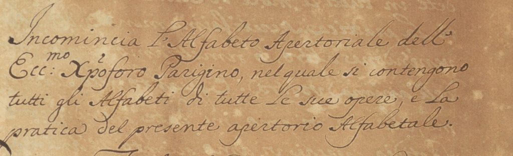 Olim: I.b.21. Manuscrito en papel, 93 páginas, de las cuales están en blanco: 1rv, 2v, 54v, 55v, 57rv, 77v, 92v y 93v. 192 x 120 mm. Buen estado de conservación, aunque falta el último fascículo de tres. Extensión temporal: 1876-1900. Sobre el dorso está el título y paternidad de la obra: “Christofa. Parigino Lucidario Violetta e Summetta”, impresa en oro sobre apósito de piel en color rojo. En la parte superior del dorso y en una pequeña etiqueta está la antigua signatura manuscrita (“I.b.21”), repetida en la contraguarda anterior, ángulo superior externo. Esta etiqueta es típica a la tropología relativa a las signaturas que se hicieron en la reorganización del fondo manuscrito, con re-enumeración paralela de los ejemplares a la que se dió curso en la Biblioteca Alessandrina durante el periodo post-unitario. En 2r, en forma de frontispicio: «Christofano Parigino diviso in tre parte [sic] dinstinte [sic] cioè in Lucidario Violetta e Summetta. Tradotta da manoscritti antichi e ridotti in manoscritti correnti con la facilità de suoi indici in fine d’ogni parte da Gaetano Bernardini medico». Encuadernación en hoja marmolizada negra y azúl, sobre cartón, con dorso en piel fina azul. Tres paginaciones diferentes originales, cada una para un texto, a la derecha y en el margen superior de cada página, con corrección de una mano actual: 1-107, 1-39 y 1-28[1]