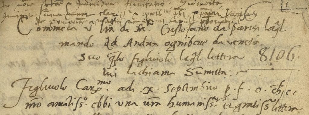 18r-20v: Andrea Ognibene (llamado en 18r como Andreas Omnibonus vetus). Destinatario del texto: Cristóforo Parisiense (citado en 18r). Titolo presente: Exemplum litterarum rescriptarum per Andream Omni bonum vetum ad magistrum Christophorum ac preceptorem suum, de quibus scilicet videtur fieri mentio (18r). Incipit (texto): “Sempre con l’usata fede ricorro al lume della profondissima nostra intelligentia” (18r).