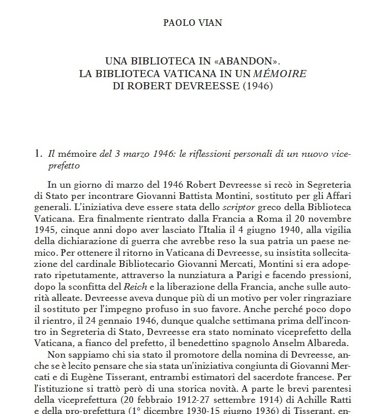 Vian, P., Una biblioteca in «abandon». La Biblioteca vaticana in un mémoire di Robert Devreesse (1946), en Miscellanea Bibliothecae Apostolicae Vaticanae XXVII (Studi e testi, 553), Città del Vaticano, 2022, 599-620: 607: