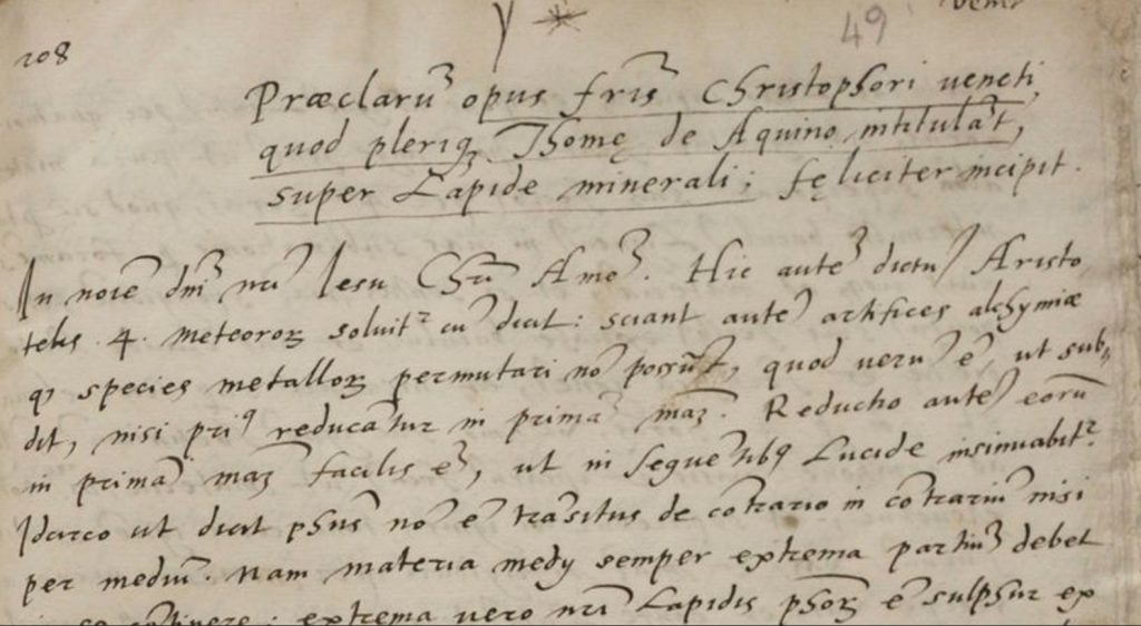 II. F. 49r. Praeclarum opus fris. Christophori ueneti quod plerique Thomae de Aquino intitulant, super Lapide minerali… INC.: In noie. dni. nri. Jesu Christi. Amen. Hic autem dictum Aristotelis 4 meteorum soluitur cum dicit… EXP.: Ubi sunt elementa? Secundus ignis. Explicit praeclarum opus fris. Christophori Veneti super Lapide minerali.