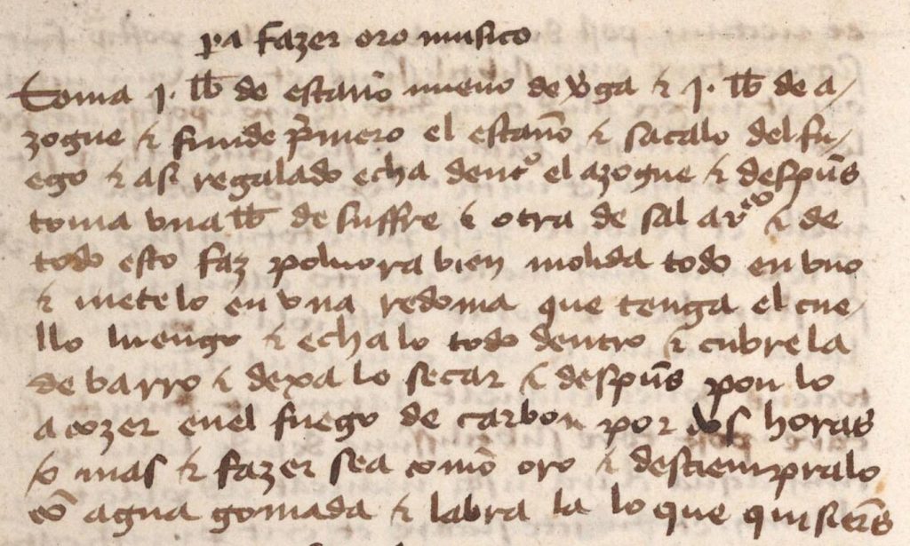 Toma i libra de estaño nueuo de verga e i libra de azogue e funde primero el estaño e sácalo del fuego, e así regulado echa dentro el azogue. E después toma vna libra de sufre e otra de sal armoniaco e de todo esto faz póluora bien molida todo en vno. E mételo en vna redoma que tenga el cuello luengo e échalo todo dentro e cúbrela de barro e déxalo secar. E después ponlo a cozer en el fuego de carbón por dos horas o más e fazerse a como oro e destiémpralo con agua gomada e lábrala lo que quisieres.