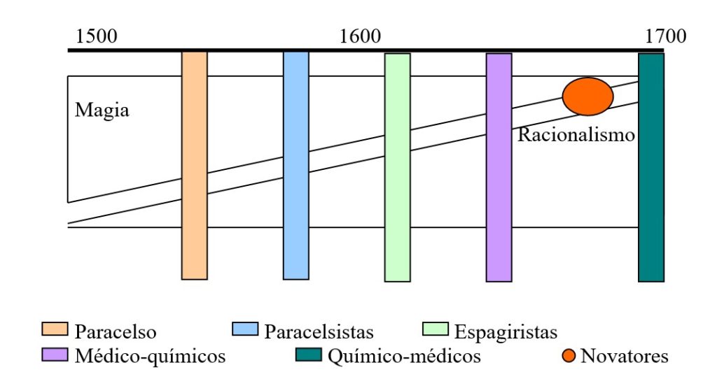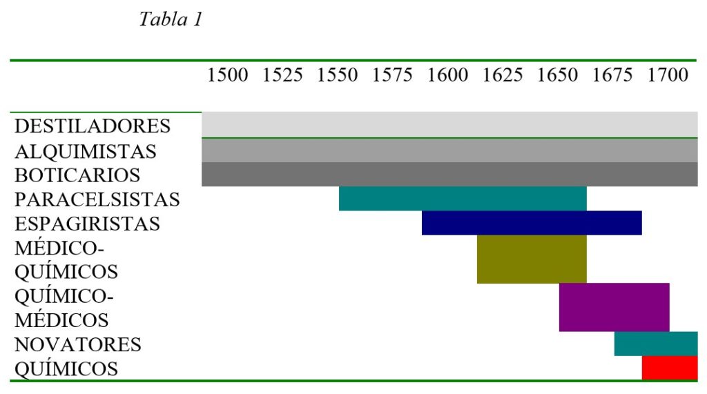 Hemos insertado una tabla, a modo orientativo, donde proponemos la mayor vigencia de unos y otros en el periodo 1500-1700. Debajo de cada tipo se adjunta una fila cuyo inicio cronológico obedece a la aparición de un autor que se llame a así mismo como dicho tipo, o bien que exista algún texto que explicite dicha condición. Creemos necesaria una revisión en la clasificación de todos los protagonistas a la vista de los nuevos datos existentes y en concordancia con nuevas investigaciones que explican que fue la Alquimia lo que había detrás de todos ellos. ¿Son galenistas aquéllos que, siendo clasificados como tales, alaban las propiedades del antimonio? ¿Qué validez tenían, en su tiempo, las bases de sus apoyos, tales como Galeno o Hermes? ¿Se trató de reivindicar las propiedades de ciertos componentes o de establecer toda una nueva disciplina, no ya médica, sino científica? Como resultado de todas estas preguntas y la búsqueda de sus respuestas se constata la carencia de solidez en cualquier tipo de clasificación. Hasta tal punto esto es así que, cuando hemos querido analizar en profundidad lo ocurrido en las dos últimas décadas del siglo XVII en la Península, algo que se expondrá más adelante, nos ha resultado difícil unir en una categoría a varias de las personas que hemos tratado.