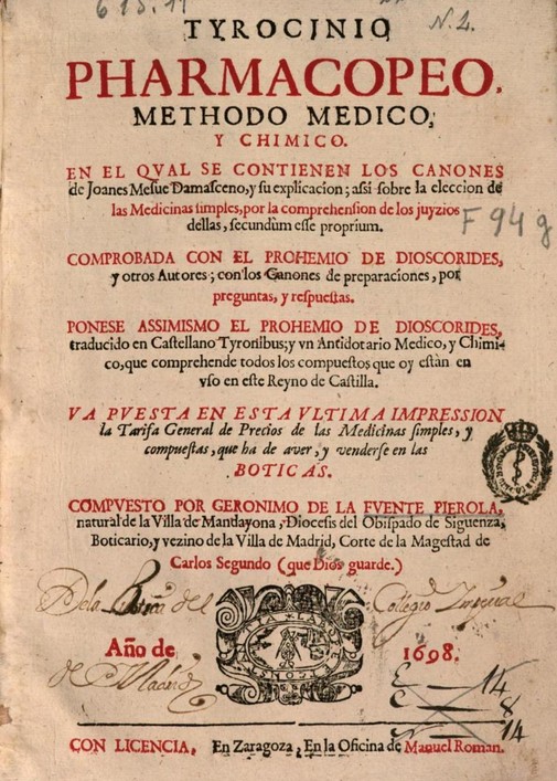 Tyrocinio pharmacopeo ;compuesto por Geronimo de la Fuente Pierola … boticario, y vezino de esta villa de Madrid … En Zaragoza, en la oficina de Manuel Román, 1698