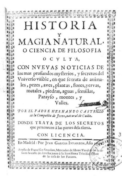 [60] Castrillo, H. de, Historia y magia natural o ciencia de filosofia oculta con nuevas noticias de los mas profundos mysterios y secretos del universo en que se trata de animales, pezes, aves, plantas, flores, yervas, metales, piedras, aguas, semillas, parayso, montes y valle. por el padre Hernando Castrillo de la Compañía de Jesús, natural de Cádiz, Trigueros, Diego Pérez, 1649. «Archimistas»: 192 y «alquimia»: 187 de la edición manejada: B.N. R-4987.