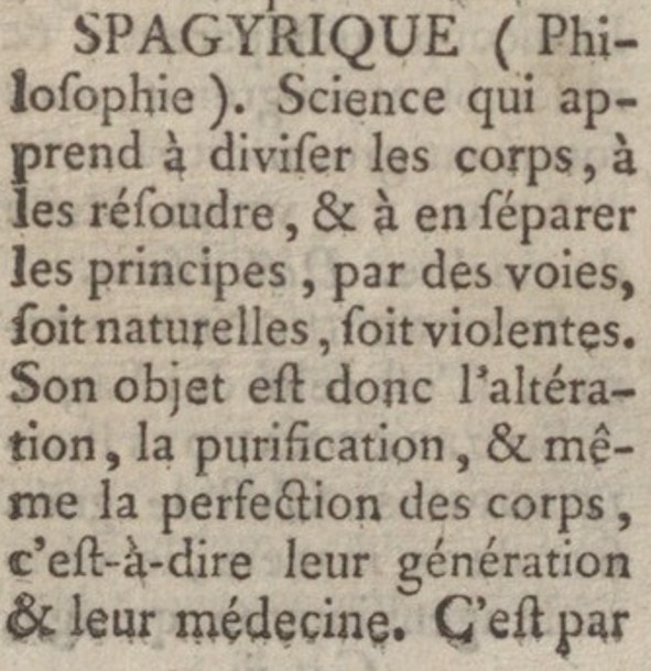 “ESPAGÍRICA (filosofía): Ciencia que enseña a dividir los cuerpos, a resolverlos y a separar sus principios con ciertas vías, sean naturales o violentas. su objeto es, por tanto, la purificación y la perfección de los cuerpos, es decir, su generación y su medicina. Por la solución puede alcanzarse pero no podría tenerse éxito en ella si se ignora su construcción y sus principios, porque estos sirven a esta disolución. Han de separarse las partes heterogéneas y accidentales, para tener la facilidad de reunir y volver a juntar íntimamente las homogéneas. La Filosofía espagírica, propiamente dicha, es lo mismo que la Filosofía Hermética.»[62]