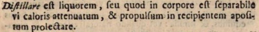 «Distillare est liquorem, seu quod in corpore este separabile vi caloris attenuatum, & propulsum in recipientem appositum prolectare. […] Modi distillationis usitatissimi sunt: per alembicum, per retortam, ac per vesicam ratione vasorum, per balneum roris, seu vaporis, per balneum Mariae, seu Maris, per cinerem, per arenam, per ignem nudum & per arenam humidam.»[68]