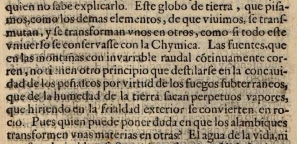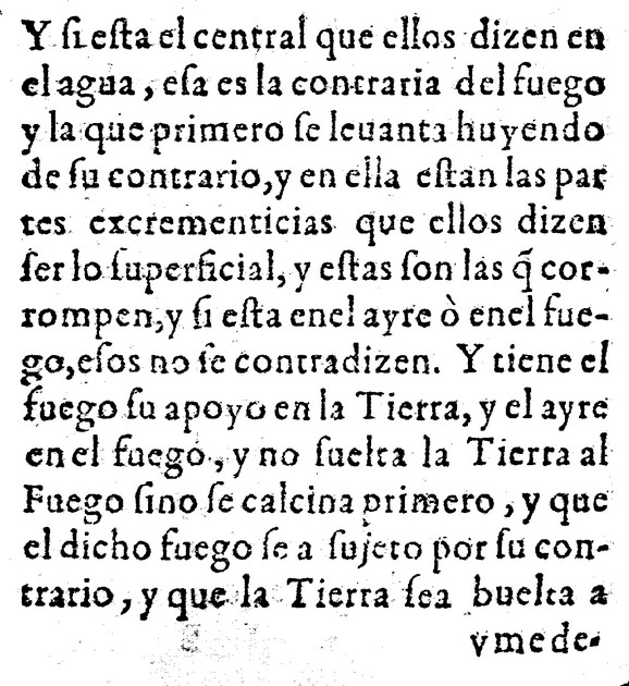 «Y si esta el central que ellos dizen en el agua, esa es la contraria del fuego y la que primero se leuanta huyendo de su contrario, y en ella estan las partes excrementicias que ellos dizen ser lo superficial, y estas son las que corrompen, y si esta en el ayre ò en el fuego, esos no le contradizen. Y tiene el fuego su apoyo en la tierra, y el ayre en el fuego, y no suelta la Tierra al Fuego sino se calcina primero, y que el dicho fuego sea sujeto por su contrario, y que la Tierra sea buelta a vmedecer no suelta de si al Fuego, ni al Ayre, El qual fuego es la sal y el Ayre el graso. Porque quando se abstrae algo destas substancias por distilacion, a de ser digiriendo y preparando y vsando de los grados necesarios de calor…»[72]