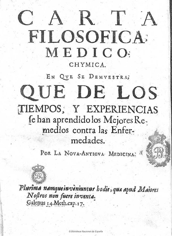 [85] Cabriada, Juan de, De los tiempos y experiencias el mejor remedio al mal por la nova antigua medicina: carta philosophica medica chimica, Madrid, Lucas Antonio de Bedmar y Baldivia, 1687.