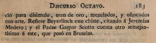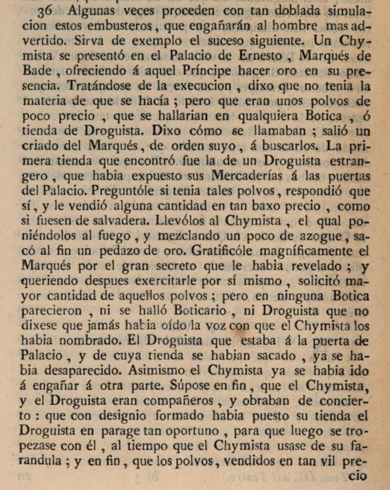 “Algunas veces proceden con tan doblada simulación estos embusteros, que engañarán al hombre más advertido. Sirva de ejemplo el suceso siguiente. Un Químico se presentó en el Palacio de Ernesto, Marqués de Baden, ofreciendo a aquel Príncipe hacer oro en su presencia. Tratándose de la ejecución, dijo que no tenía la materia de se hacía; pero que eran unos polvos de poco precio, que se hallarían en cualquiera Botica, o tienda de Droguista. Dijo cómo se llamaban; salió un criado del Marqués de orden suyo, a buscarlos. La primera tienda que encontró fue la de un Droguista extranjero que había expuesto sus Mercaderías a las puertas del Palacio. Preguntóle si tenía tales polvos, respondió que sí, y le vendió alguna cantidad en tan bajo precio, como si fuesen de salvadera. Llevólos al Quimista, el cual poniéndolos al fuego, y mezclando un poco de azogue, sacó al fin un pedazo de oro. Gratificóle magníficamente el Marqués por el gran secreto que le había revelado; y queriendo después ejercitarle por sí mismo, solicitó mayor cantidad de aquellos polvos; pero en ninguna Botica parecieron, ni se halló Boticario, ni Droguista que no dijese que jamás había oído la voz con que el Quimista los había nombrado. El Droguista que estaba a la puerta de Palacio, y de cuya tienda se habían sacado, ya se había desaparecido. Asimismo el Quimista ya se había ido a engañar a otra parte. Súpose en fin, que el Quimista, y el Droguista eran compañeros, y obraban de concierto: que con designio formado había puesto su tienda el Droguista en paraje tan oportuno, para que luego se tropezase con él, al tiempo que el Quimista usase de su farándula; y en fin, que los polvos, vendidos en tan vil precio para disimulo, eran de oro, mezclados, y ofuscados con arte. Refiere Beyerlinck1 este chiste, citando a Jeremías Medero; y el Padre Gaspar Scotto cuenta otro semejantísimo a este2, que pasó en Bruselas3.