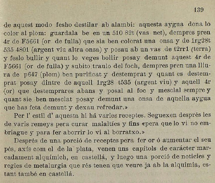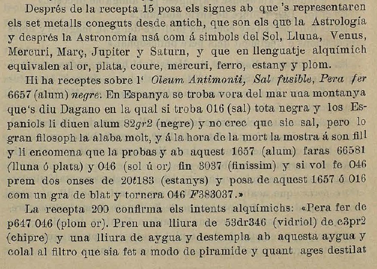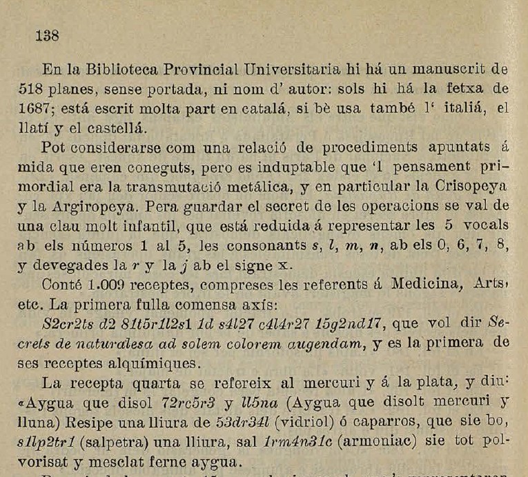 S2cr2ts d2 81tr11251 1ds4l em c414r27 15g2nd17. (Secrets de naturalesa ad solem (oro) colorem augendam) Inc.: Recipe un marc de c45r2 de s4fr2 (coure de sofre)…Expl.»Color az56 para láminas»:a+.-(fol. 259) Taula universal, por orden alfabético (Es una compilación de 1.009 recetas cifradas, de autor anónimo, escritas en catalán, latín, castellano e italiano. La clave se reduce a representar el valor de las cinco vocales con los cinco primeros guarismos y el de las consonantes se limita a sustituir la m, n, l y s por los números 7,8,6 y 0 respectivamente.- Para una información más detallada del contenido de este Manuscrito y de su supuesto autor: Cfr.: José Ramón Luanco: La Alquimia en España. I . Barcelona, 1889, pág. 25-50).
