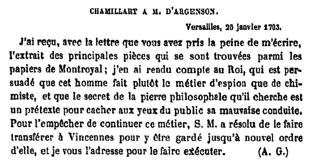 Lettre de Chamillart a M. D’Argenson, Versailles, 20 janvier 1703. «J’ai reçu, avec la lettre que vous avez pris la peine de m’écrire l’extrait desprincipales pièces qui se sont trouvées parmi las paiers de Montroyal; j’en ai rendu compte au Roi, qui est persuadé que cet homme fait plutôt le metier d’espion que de chimiste, et que le secret de la pierre philosophale qu’ilcherche est un prétexte pour chacher aux yeuz du public sa mauvaise conduite. Pour l’empêcher de continuer ce métier, S. M. a resolú de le faire tranférer à Vicennes pour y être gardé jusq’à novel ordre d’elle, et je vous l’adresse pour le faire exécuter»