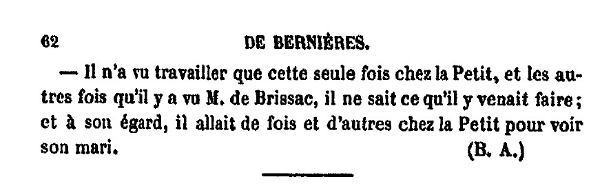 Archives de la Bastille, vol. 6, p. 61-62. François de Bernières, chevalier de l’ordre de Saint-Jean-de-Jérusalem et de Notre-Dame-du-Mont-Carmel, natif de Bry en Normandie, âgé de cinquante-six ams. –Quelles affaires ila faites avec la Petit? –Il a été chez la Petit avec M. le duc de Brissac, deux ou trois fois, et c’était pour une realité qui était proposée par Mely, apothicaire, que a été depuis apothicaire de M. de Nourra. Mely est mort depuis deux ou trois ans, et était de Valence en Dauphiné. –Ques apprêts furent faits chez la Petit pour faire cette épreuve? –C’était pour l’or et de l’argent mélés ensemble, et Mely avait apporté les ingrédients et fait les apprêts, et ne me vitautre chose que mettre dans un creuset de l’or et de l’argent par Mely, avec de la composition quìlavait préparée; mais cela ne réussit pas, et cela n’était bon pour faire pendre. –Pourquoi il retournait chez la PEtit pour le secret, puisqu’il n’avait pas réussi? — Il nà vu travailler que cette seule fois la Petit, et les autres fois qu’l y a vu M. de Brissanc, il ne sait ce qu’il y venait faire; et à son égard, il allait de fois et d’autres chez la Petit pour voir son mari.
