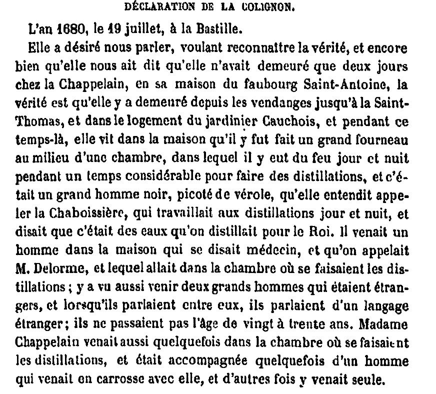 Archives de la Bastille, Vol. 6, 260, déclaration de la Colignon, l’an 1680, le 19 julliet, à la Bastille.Elle a desiré nous parler, voulant reconnaître la vérité, et encore bien qu’elle nous ait dit que’elle n’avait demeuré que deuz jours chez la Chappelain, en sa maison du fauburg Saint-Antoine, la vérité est qu’elle y a demeuré depuis les vedanges jusqu’á la Saint-Thomas, et dans le logement du jardinier Cauchois, et pendant ce temps-là, elle vit dans la maison qu’il y fut fait un grand fourneau au milieu d’une chambre dans lequel il y eut dufeu jour et nuit pendant un temps considérable pour faire des distillations, et c’était ungrand homme noir, picoté de vérole, qu’elle entendit appeler la Chaboissière, qui travallait aux distillations jour et nuit, et disait que c’était des euaux qu’on distillait pour le Roi. Il venait un home dans la maison que se disait médecin, et qu’on appelait M. Delore,et lequel allait dans la chambre où se faisaient les distillations; y a vu aussi venir deux grands hommes qui étaient étrangers, et lorqu’ils parlaient entre eux, ls parlaient d’un langageétranger; ilsne passaient pas l’âge de vingt à trente ans. Madame Chappelain venait aussi quelquefois dans la chambre où se faisaient lesdistillations, et était accompagné quelquefois d’un homme que venait en carrosse avec elle, et d’autres fois y venait seule.