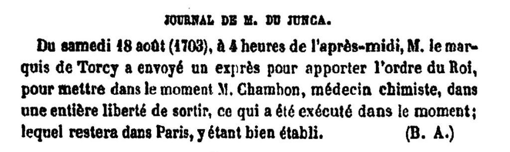 DIARIO DE M. DU JUNCA. El sábado 18 de agosto (1703), a las 4 de la tarde, el Marqués de Torcy envió un expreso para entregar la orden del Rey de dar inmediatamente al Sr. Chambon, químico, plena libertad para salir, la cual se ejecutó de inmediato; permanecerá en París, pues allí se encuentra bien establecido.