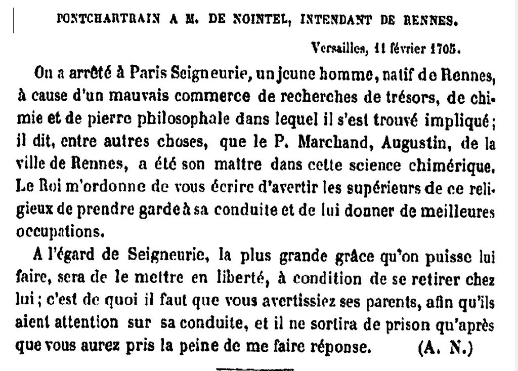 Un joven, nacido en Rennes, fue arrestado en París, Seigneurie, por estar involucrado en un turbio negocio relacionado con la búsqueda de tesoros, la química y la piedra filosofal. Dice, entre otras cosas, que el padre Marchand, Augustino, de la ciudad de Rennes, fue su maestro en esta ciencia quimérica. El Rey me ordena escribirle para advertir a los superiores de este monje que vigilen su conducta y le asignen mejores ocupaciones.