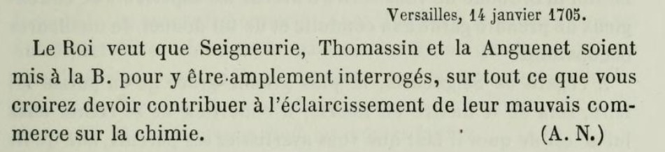 Le Roi veut que Seigneurie, Thomassin et la Anguenet soient mis à la B. pour y êtreamplement interrogés, sur tout ce que vous croirez devoir contribuer à l’éclaircissement de leur mauvais commerce sur la chimie.