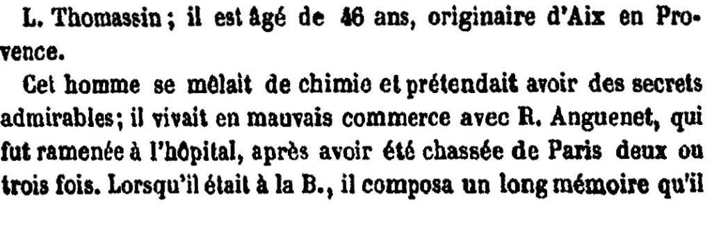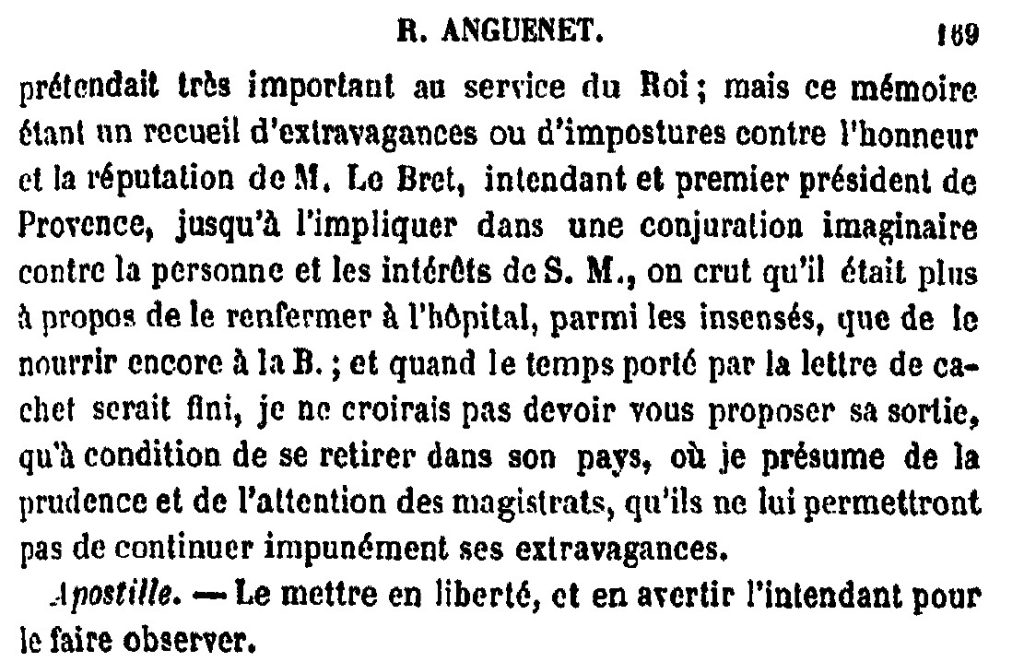 Este hombre se dedicaba a la química y afirmaba tener secretos admirables; vivía en malos términos con R. Anguenet, quien fue llevado de vuelta al hospital tras haber sido expulsado de París dos o tres veces. Cuando estaba en la B[astilla], compuso unas largas memorias que, según él, fueron muy importantes para el servicio del Rey; pero, al ser estas memorias una colección de extravagancias o imposturas contra el honor y la reputación de M. Le Bret, intendente y primer presidente de Provenza, hasta el punto de implicarlo en una conspiración imaginaria contra la persona y los intereses de Su Majestad, se creyó que era más apropiado encerrarlo en el hospital, entre los enfermos mentales, que mantenerlo alimentado en la B[astilla]. y cuando haya transcurrido el tiempo previsto por la carta del sello, no creo poder proponerle su liberación, salvo con la condición de que se retire a su país, donde presumo, por la prudencia y atención de los magistrados, que no le permitirán continuar impunemente con sus extravagancias.